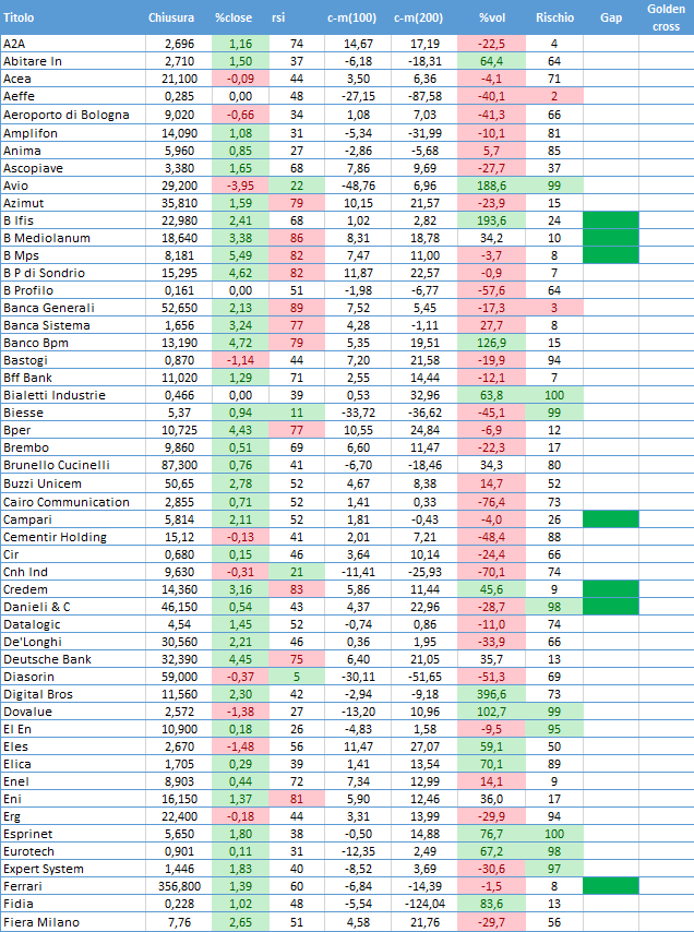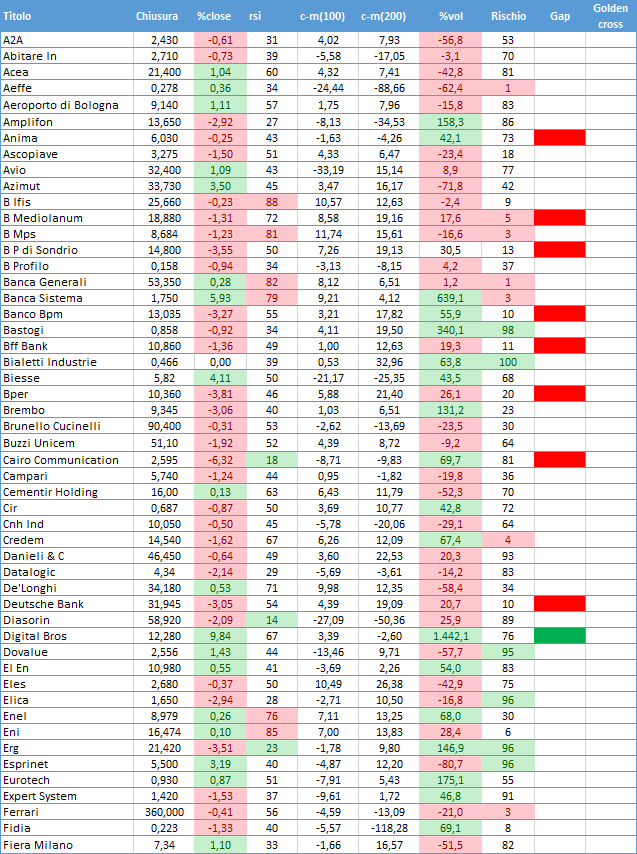 Gap: titoli che hanno aperto un gap al rialzo (indicato con un rettangolo verde) o al ribasso (rettangolo rosso)