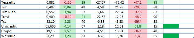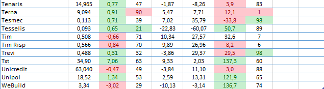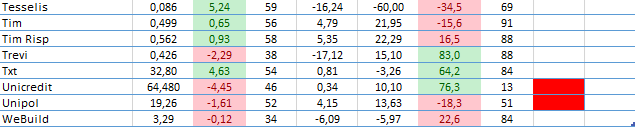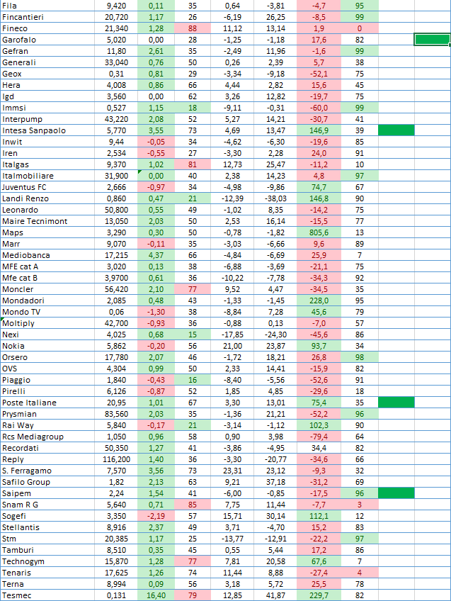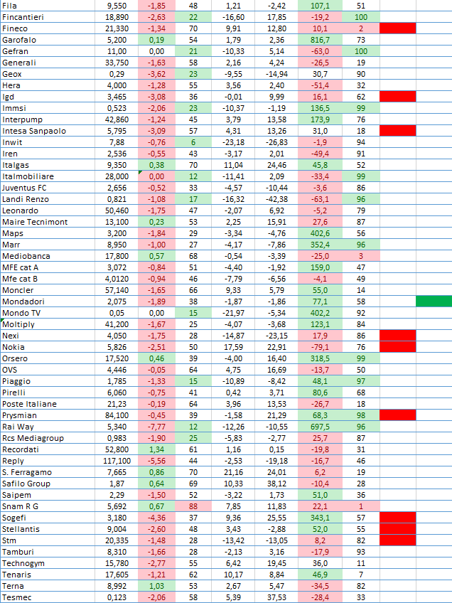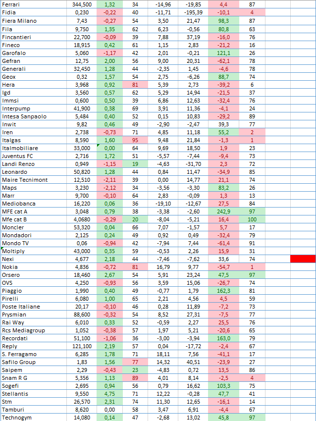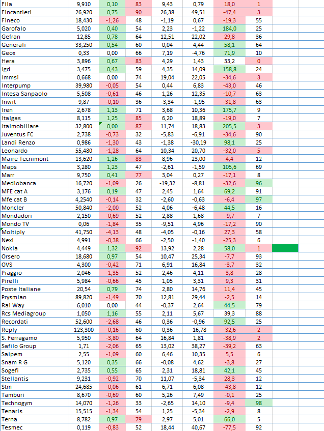 Rsi: indicatore di momentum calcolato su un periodo di 7 gg. In verde i titoli in ipercomprato (>70), in rosso in ipervenduto (<25);