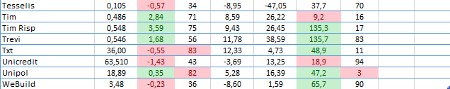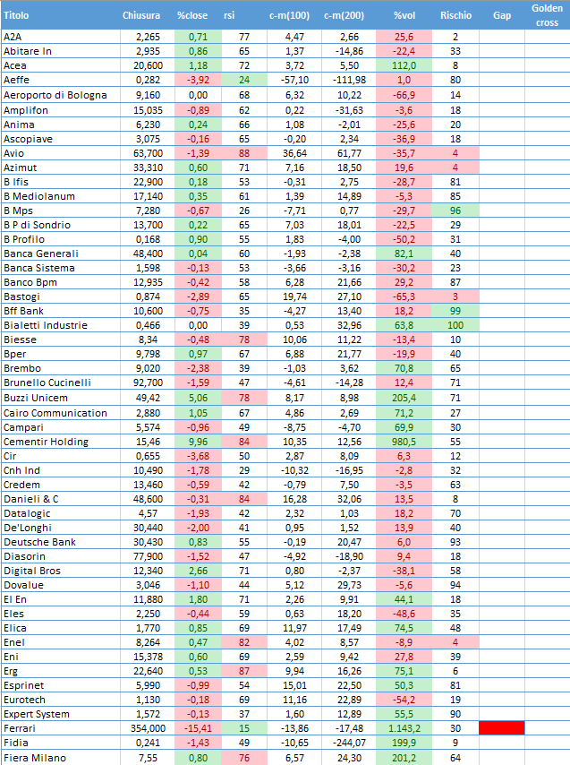 Pubblichiamo questa tabella con l'obiettivo di fornire una fotografia dell'andamento della seduta su un numero selezionato di titoli (circa un centinaio). Abbiamo preso in considerazione le variabili più usate in analisi: chiusura, momentum, medie mobili e volumi evidenziando dove si sono formate delle "forzature" usando i consueti colori (rosso = negativo, verde = positivo) In tabella abbiamo inserito anche i titoli che hanno aperto un gap al rialzo o al ribasso.