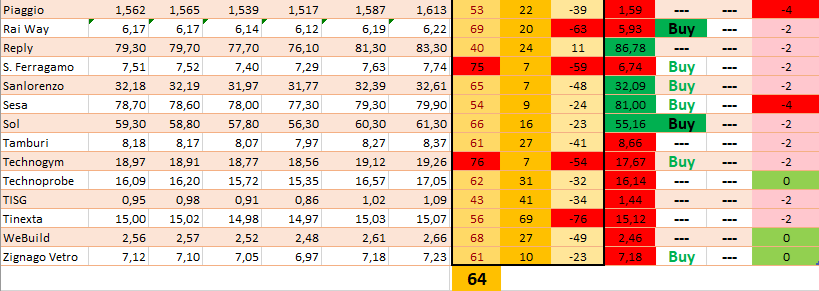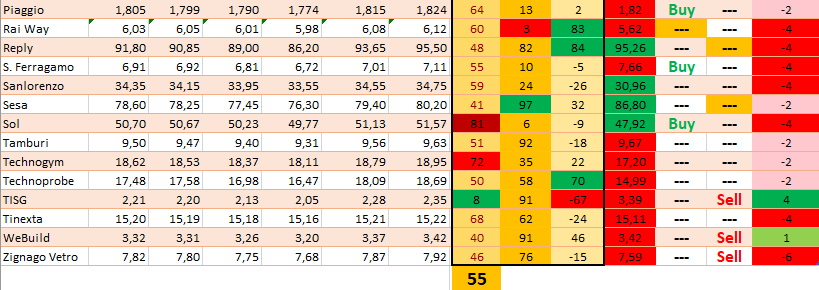 Segnale: il colore della casella sarà verde quando il valore sarà inferiore alla chiusura e al contrario quando è rossa. La colorazione determinerà la tendenza del titolo nel breve termine (2/3 settimane) e al cambio di colore si avrà un peggioramento netto del quadro tecnico. Indicatore da collegare agli indicatori perché se vi sarà eccesso ribassista (casella verde) degli indicatori e rossa per quanto concerne il Segnale, prestare attenzione all'inversione di tendenza che potrebbe essere imminente.