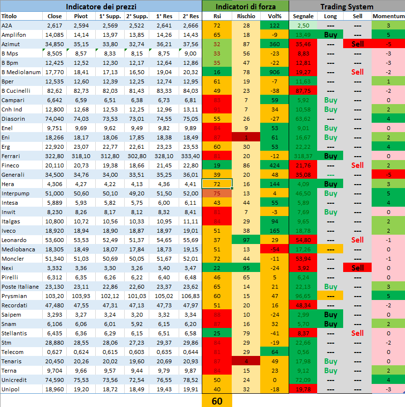 Pivot e Ipercomprato/Venduto titoli Ftse Mib 40 - chiusura 11 febbraio