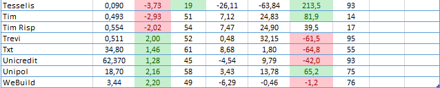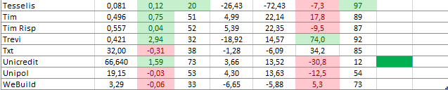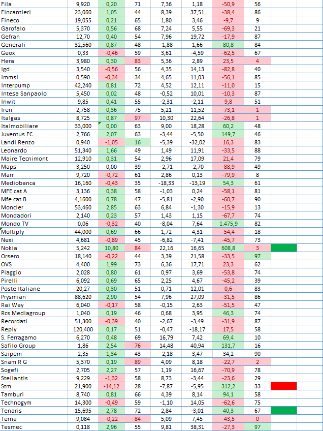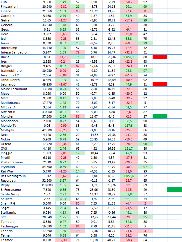 Rsi: indicatore di momentum calcolato su un periodo di 7 gg. In verde i titoli in ipercomprato (>70), in rosso in ipervenduto (<25);