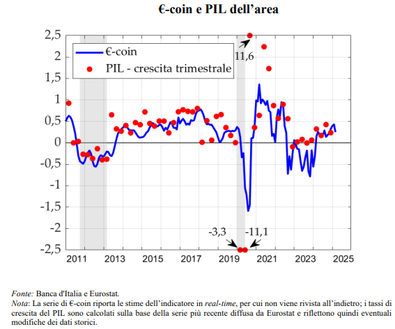 €-coin – sviluppato dalla Banca d’Italia – fornisce in tempo reale una stima sintetica del quadro congiunturale corrente nell’area dell’euro, esprimendo tale indicazione in termini di tasso di crescita trimestrale del PIL depurato dalle componenti più erratiche (stagionalità, errori di misura e volatilità di breve periodo). È pubblicato mensilmente dalla Banca d’Italia e dal CEPR.
