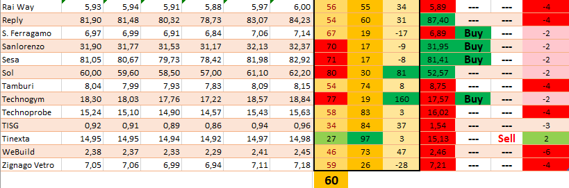 Segnale: il colore della casella sarà verde quando il valore sarà inferiore alla chiusura e al contrario quando è rossa. La colorazione determinerà la tendenza del titolo nel breve termine (2/3 settimane) e al cambio di colore si avrà un peggioramento netto del quadro tecnico. Indicatore da collegare agli indicatori perché se vi sarà eccesso ribassista (casella verde) degli indicatori e rossa per quanto concerne il Segnale, prestare attenzione all'inversione di tendenza che potrebbe essere imminente.