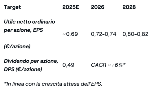 · Si prevede un Utile netto ordinario per azione (EPS) in crescita al 2028 fino a un valore compreso tra 0,80 e 0,82 euro rispetto a circa 0,69 euro attesi nel 2025
