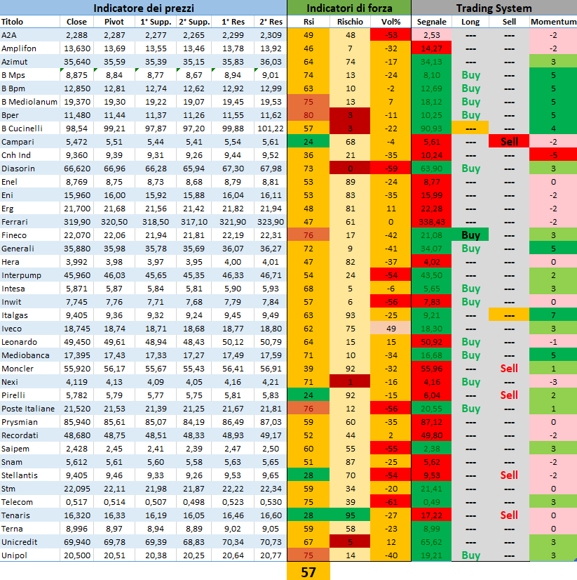 Pivot e Ipercomprato/Venduto titoli Ftse Mib 40 - chiusura 23 dicembre