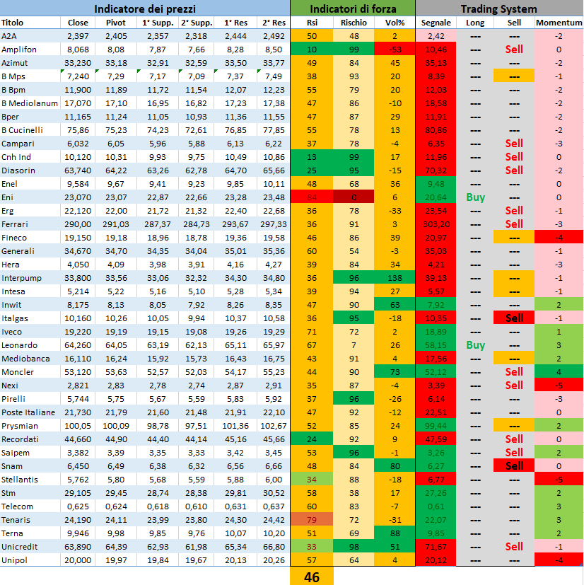 Pivot e Ipercomprato/Venduto titoli Ftse Mib 40 - chiusura 18 marzo