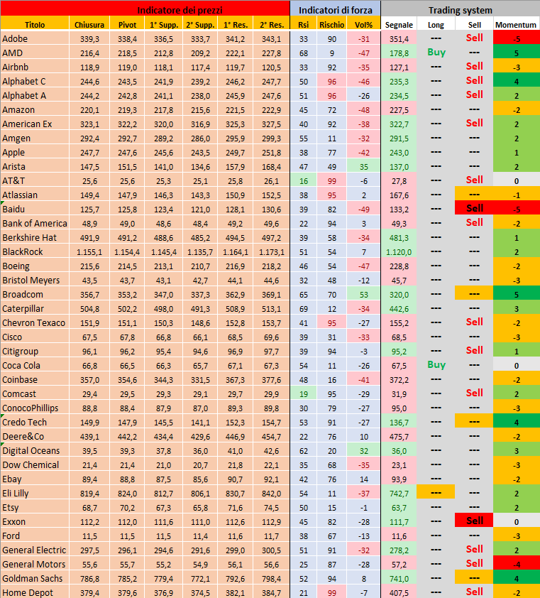 Pivot e Ipercomprato/Venduto Titoli Usa per la seduta - 13 ottobre