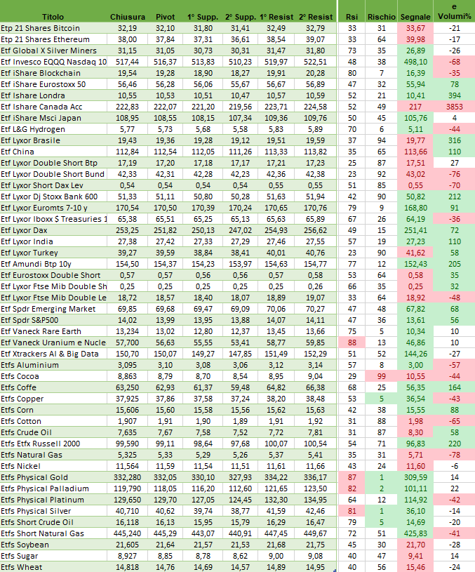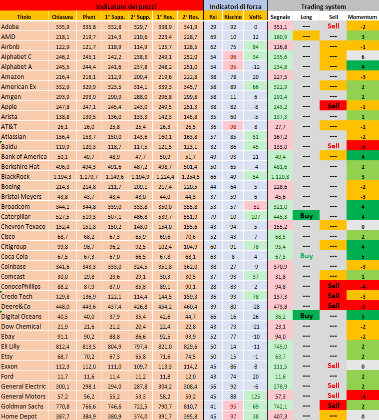 Pivot e Ipercomprato/Venduto Titoli Usa per la seduta - 14 ottobre