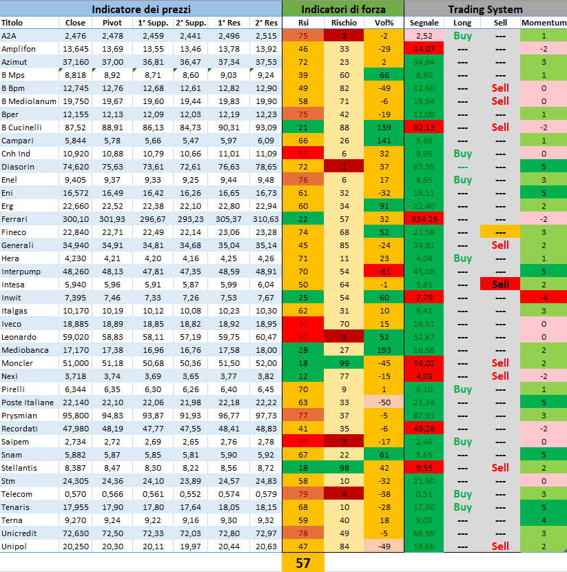 Pivot e Ipercomprato/Venduto titoli Ftse Mib 40 - chiusura 16 gennaio